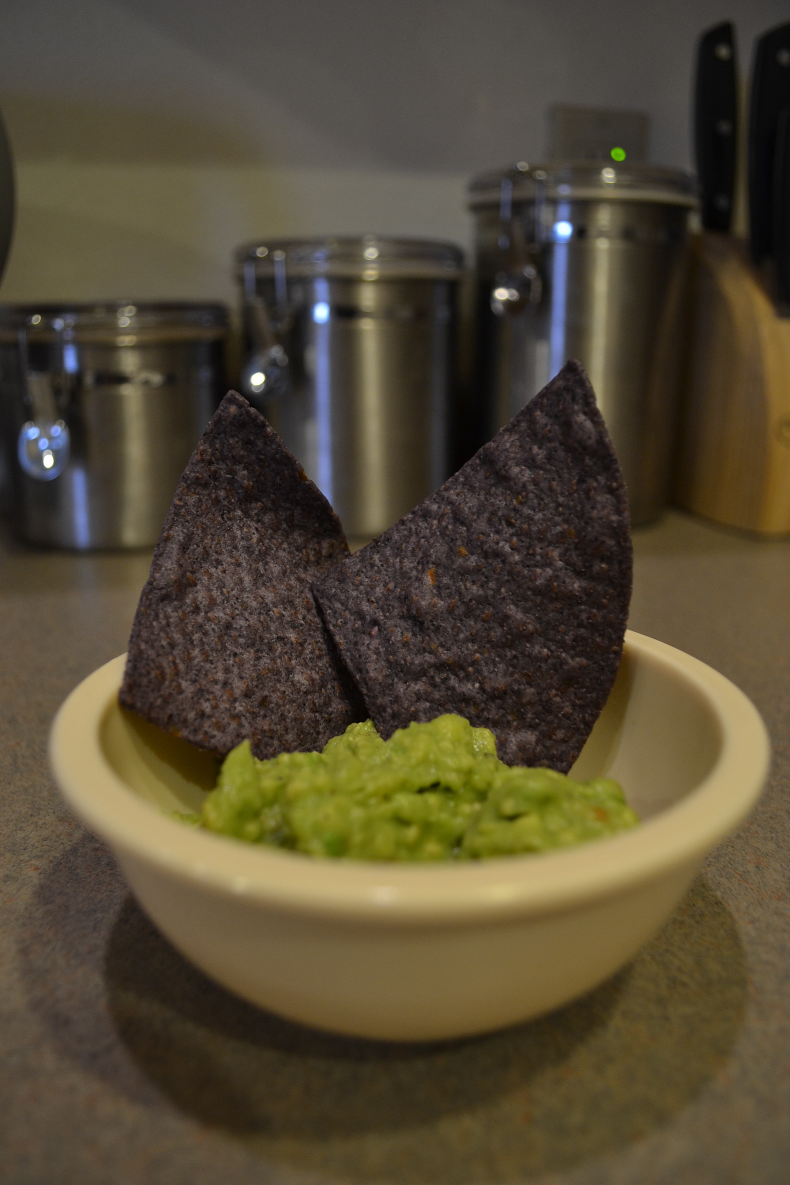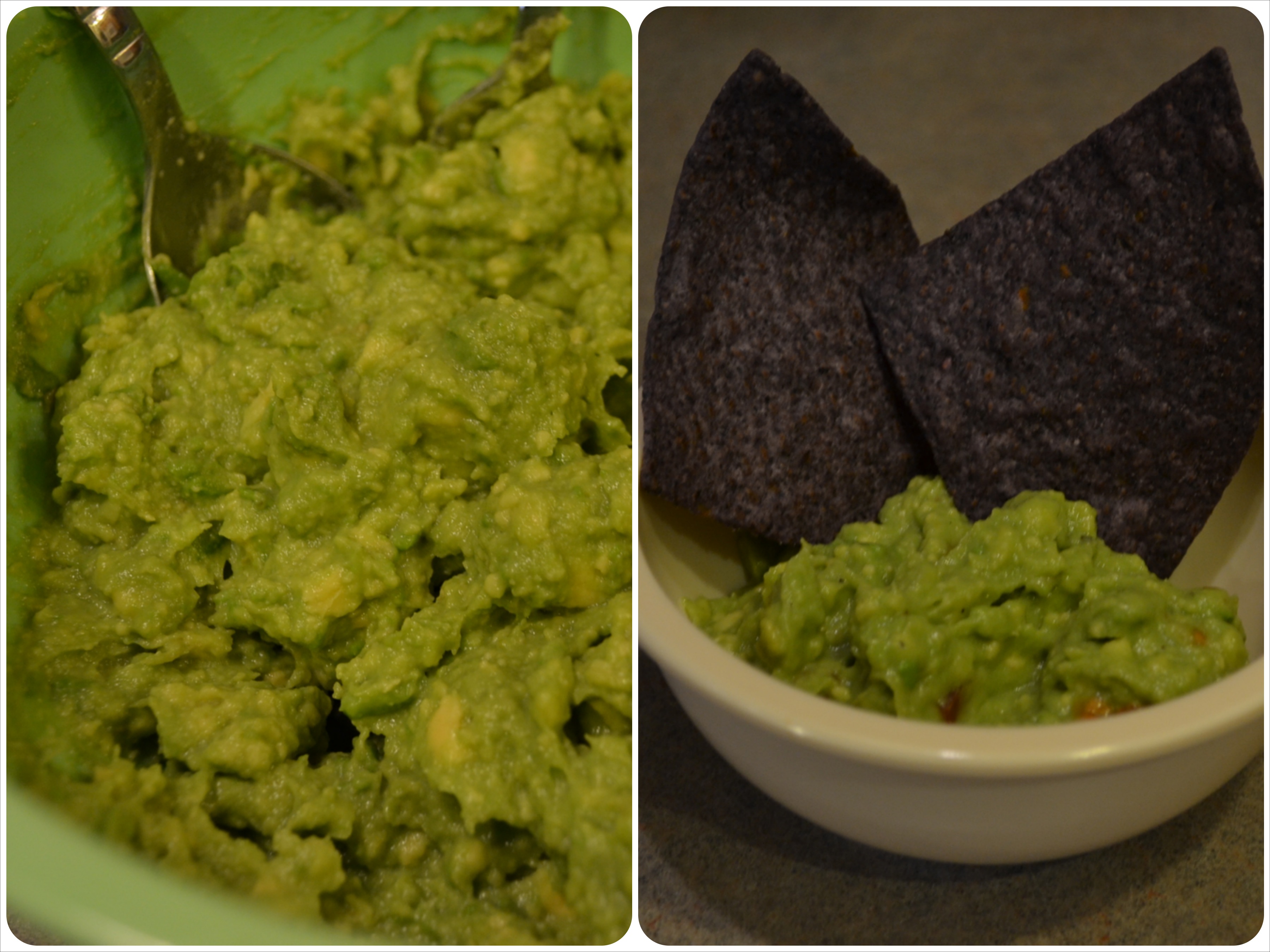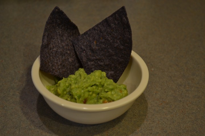 5. You’re done! Scoop out guac onto a serving bowl and top with blue corn chips (or chips of your choice!)