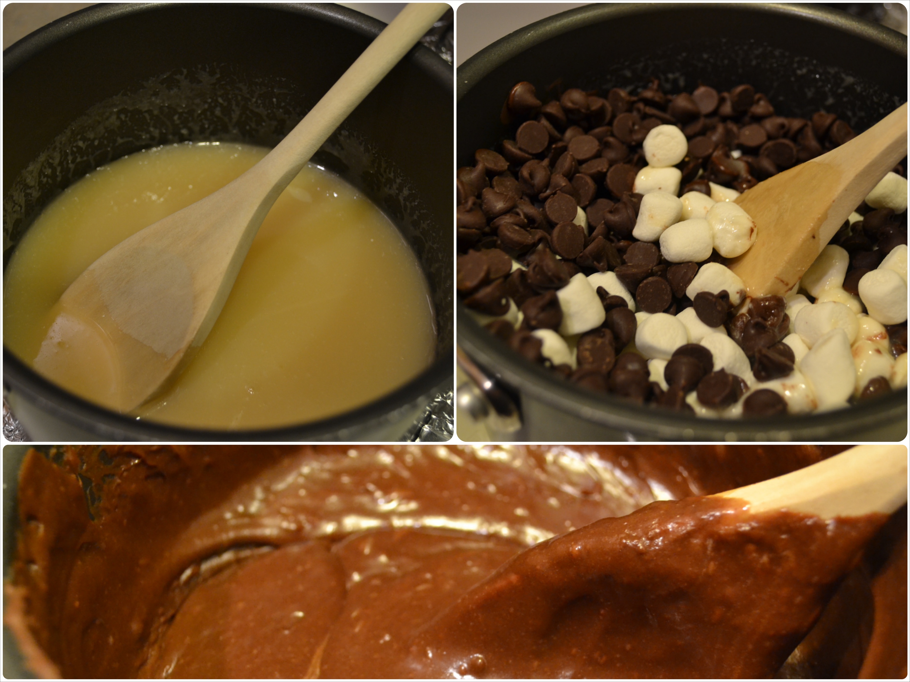 5. Add the mini marshmallows and chocolate chips to the mixture, and stir until the marshmallows and chocolate chips are melted. If you want to add the peppermint extract for a minty fudge, add it when the mixture is completely homogenous and stir.