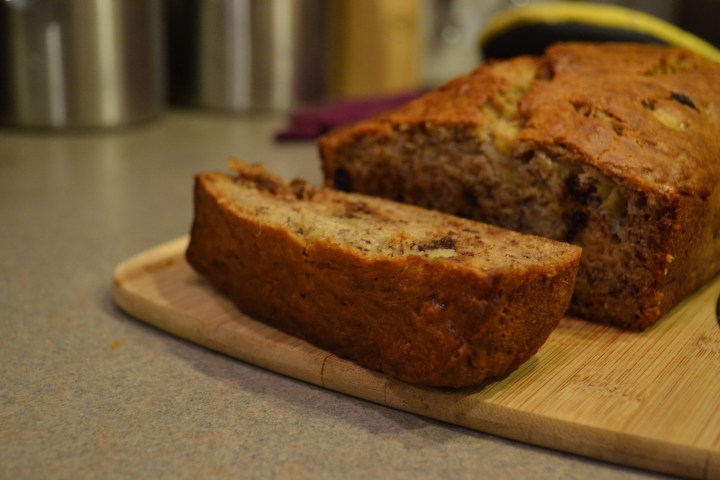 One of my favorite things to bake is banana bread. Here is a super easy, one-bowl recipe, and you don’t even need an electric mixer! I made a chocolate chip banana bread here, but feel free to add walnuts, raisins, or any other add-in of your choice!