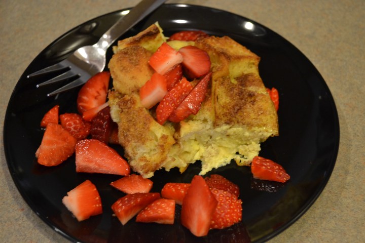 Last month, I got some egg nog on clearance at my local grocery store for about $2. I’ve never had egg nog before, and I wasn’t sure if I was going to like it. Turns out, I did not. So what’s a girl going to do with an entire bottle of egg nog? I’ve made french toast casserole before, and I tweaked the recipe to use the egg nog. The result? Delicious french toast casserole with a kick of the egg nog. The egg nog also pairs wonderfully with the cinnamon and nutmeg.