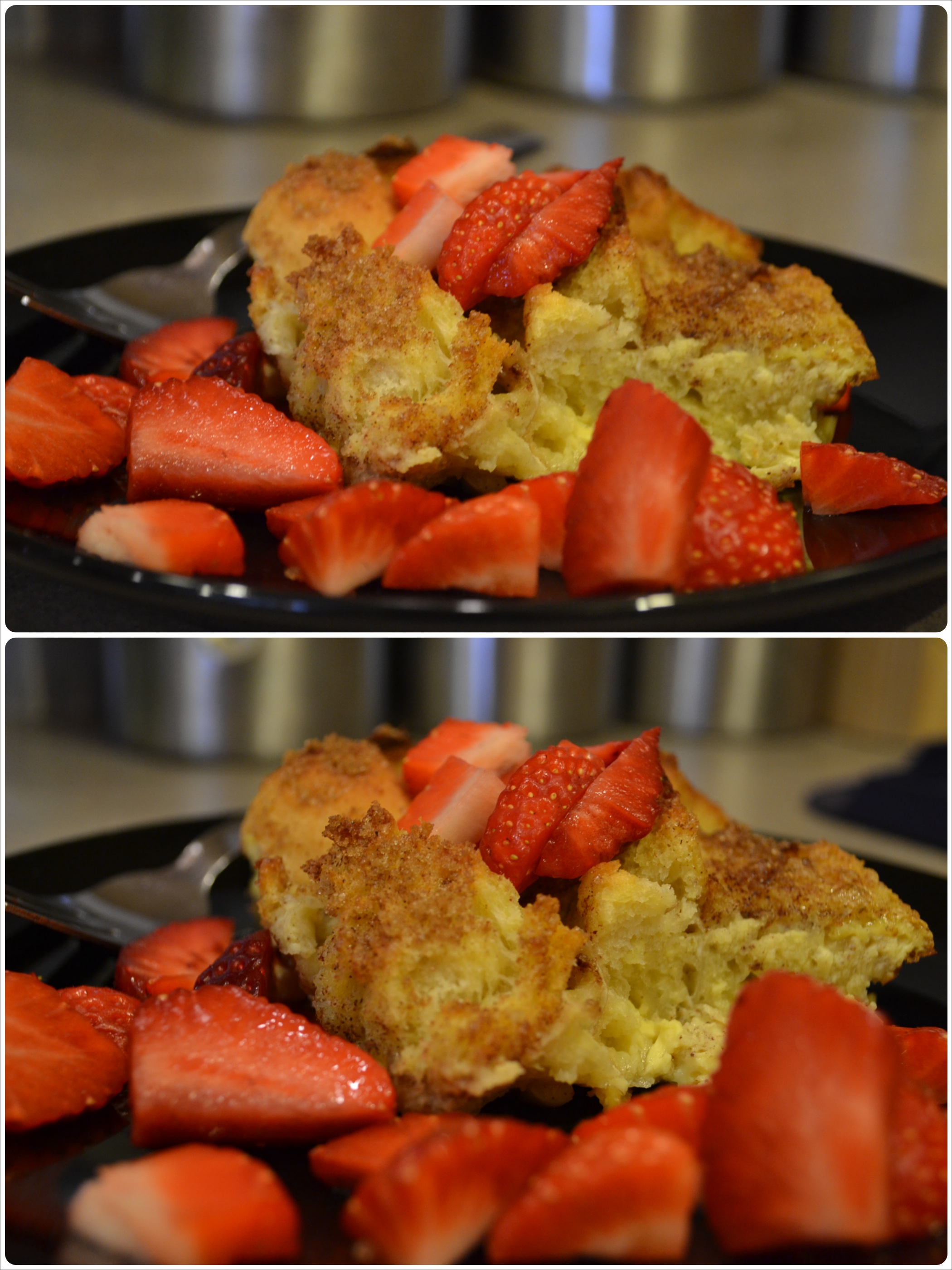 6. Bake for 45 minutes, uncovered. Serve with berries and powdered sugar.