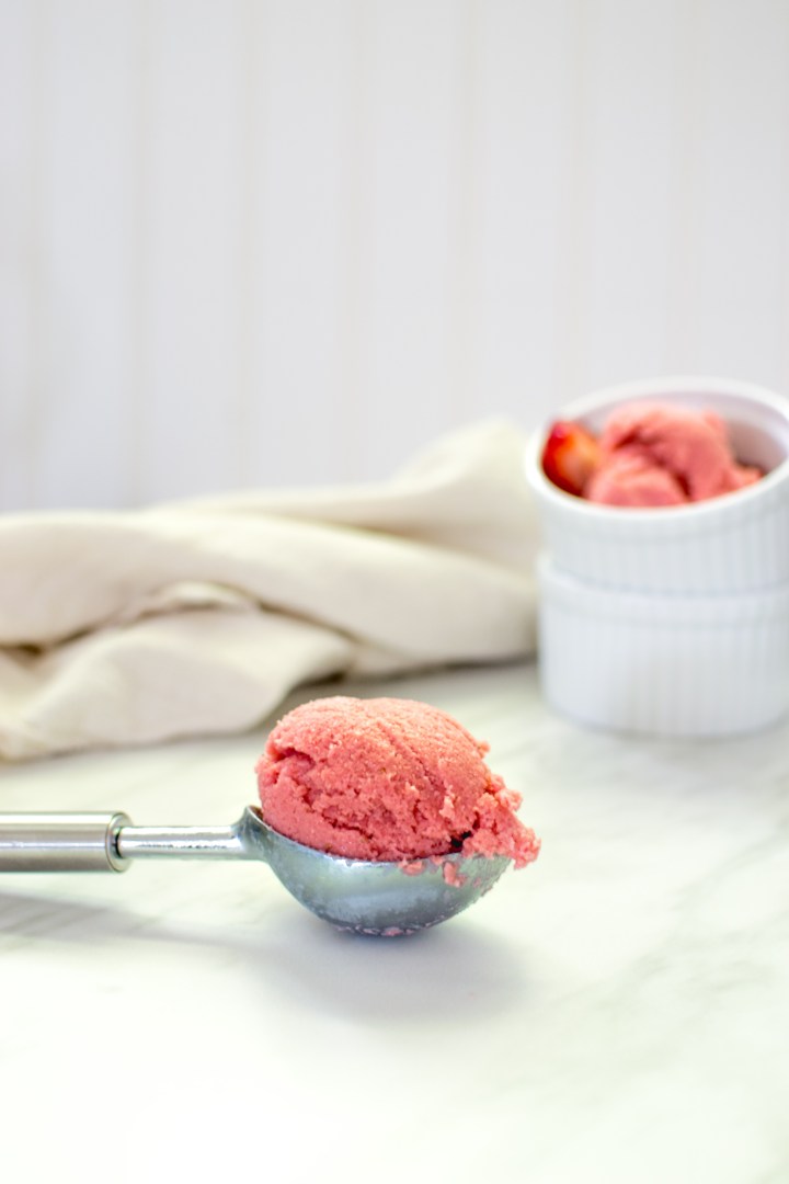 This strawberry frozen Greek yogurt is so stupid easy to make, and it requires only 3 ingredients. It’s the perfect summer treat that will both satisfy your sweet tooth and ice cream cravings while being a much healthier alternative!