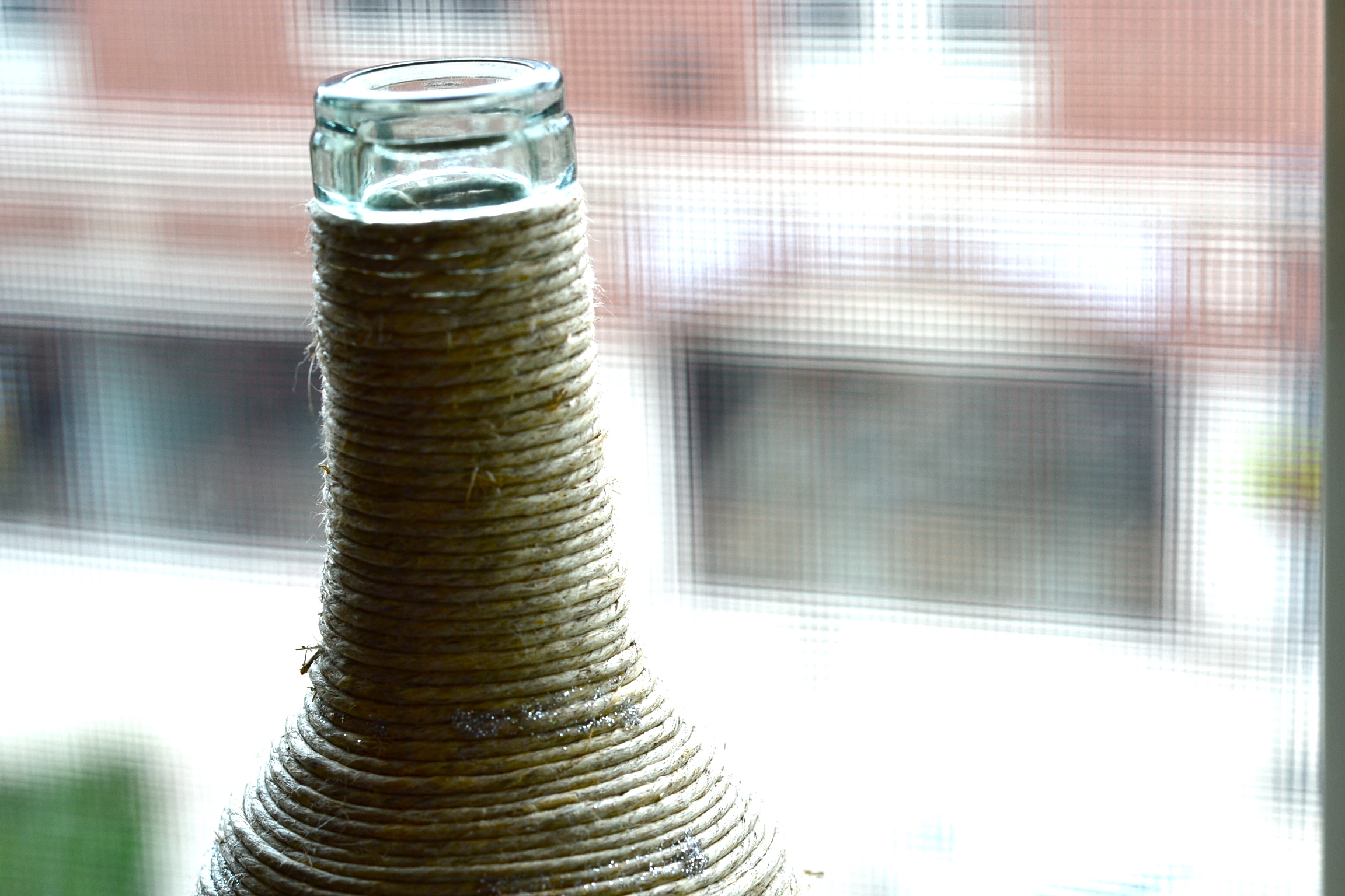 I’ve seen these DIY twine bottles floating around on Pinterest, I have even seen them at furniture boutiques. They are pretty darn easy, and with the right technique, it should take no more than 15 minutes per bottle.