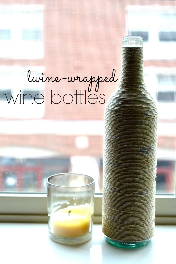 Glue is really not necessary. All you need to do it to start the twine from the top of the bottle. The easiest way is to tie a tight deadknot on the top, and start circling down. Make sure to wrap over the end twine from the knot. Gently push up as you go. Around the part where there is the curvature in the wine bottle, it will seem a little bit difficult to wrap as the twine might unravel. Don’t fret. If you don’t feel secure doing this, dot some glue as you wrap the twine to ensure security. When you get to the bottom of the bottle, make another deadknot, glue the ends if needed.