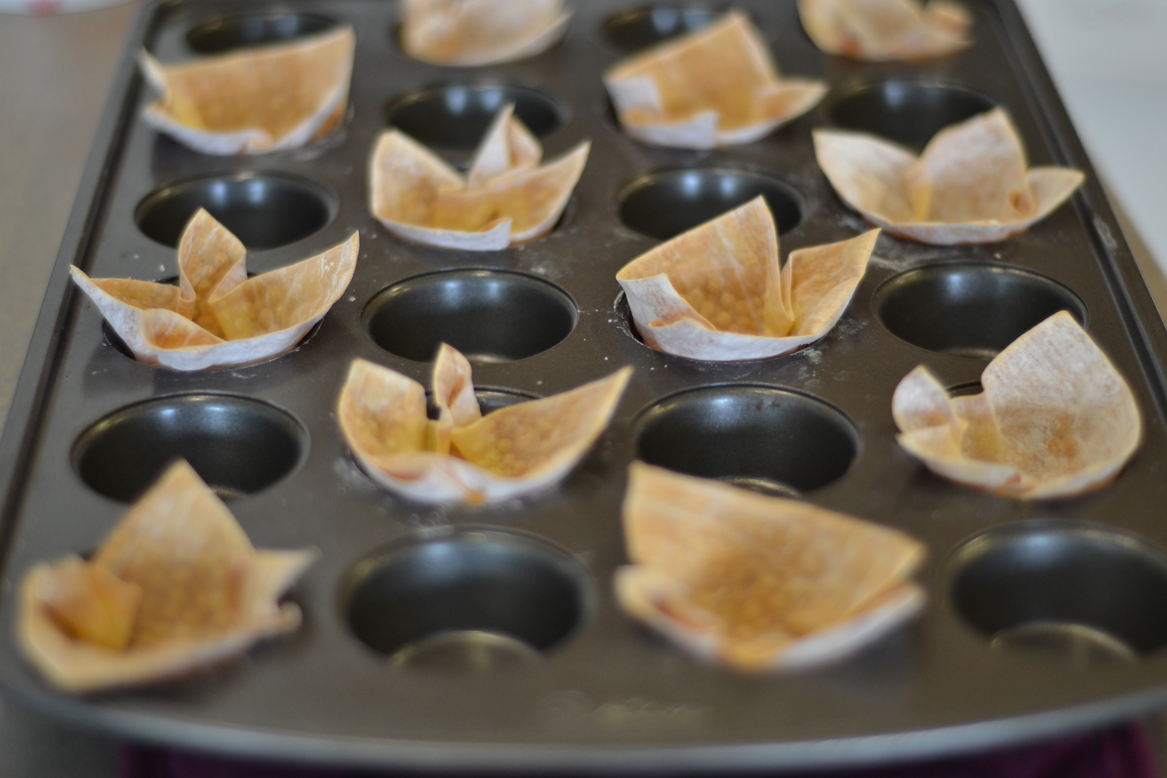 3. Pre-heat oven to 350 degrees. Using mini-muffin pans (the ones with 24 cups per pan), press wonton wrappers into the pan (you will do this in several batches). Using a pastry brush, brush each cup with the melted butter. Bake for 10-15 minutes, or until golden brown.