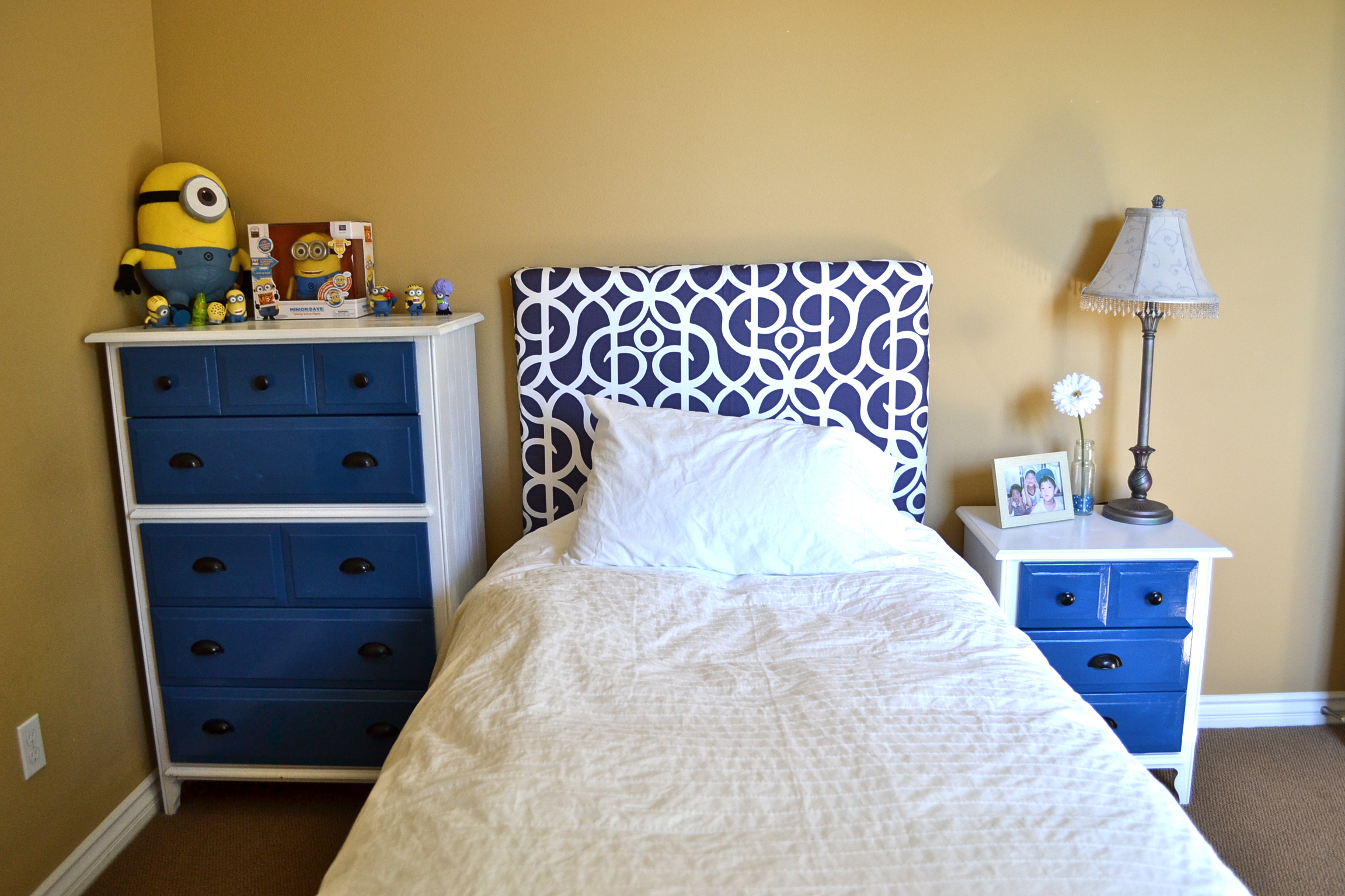 *Bonus: I also whipped up a twin-sized headboard for the guest bedroom. You might recognize the fabric … it’s the same as the fabric I used for my reupholstered armchair! For now, this room is done. I might hit up Goodwill at some point and find some nifty artwork to refurbish for this room.