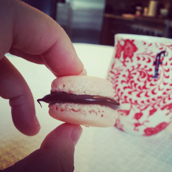 To assemble: Find twins of every macaron shell. Lay them belly up. Using a pastry bag, pipe out the Nutella buttercream on one of macaron pairs and gently squeeze the two shells together.