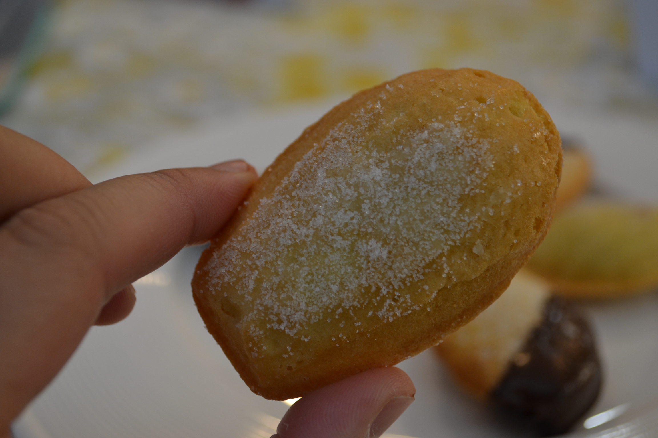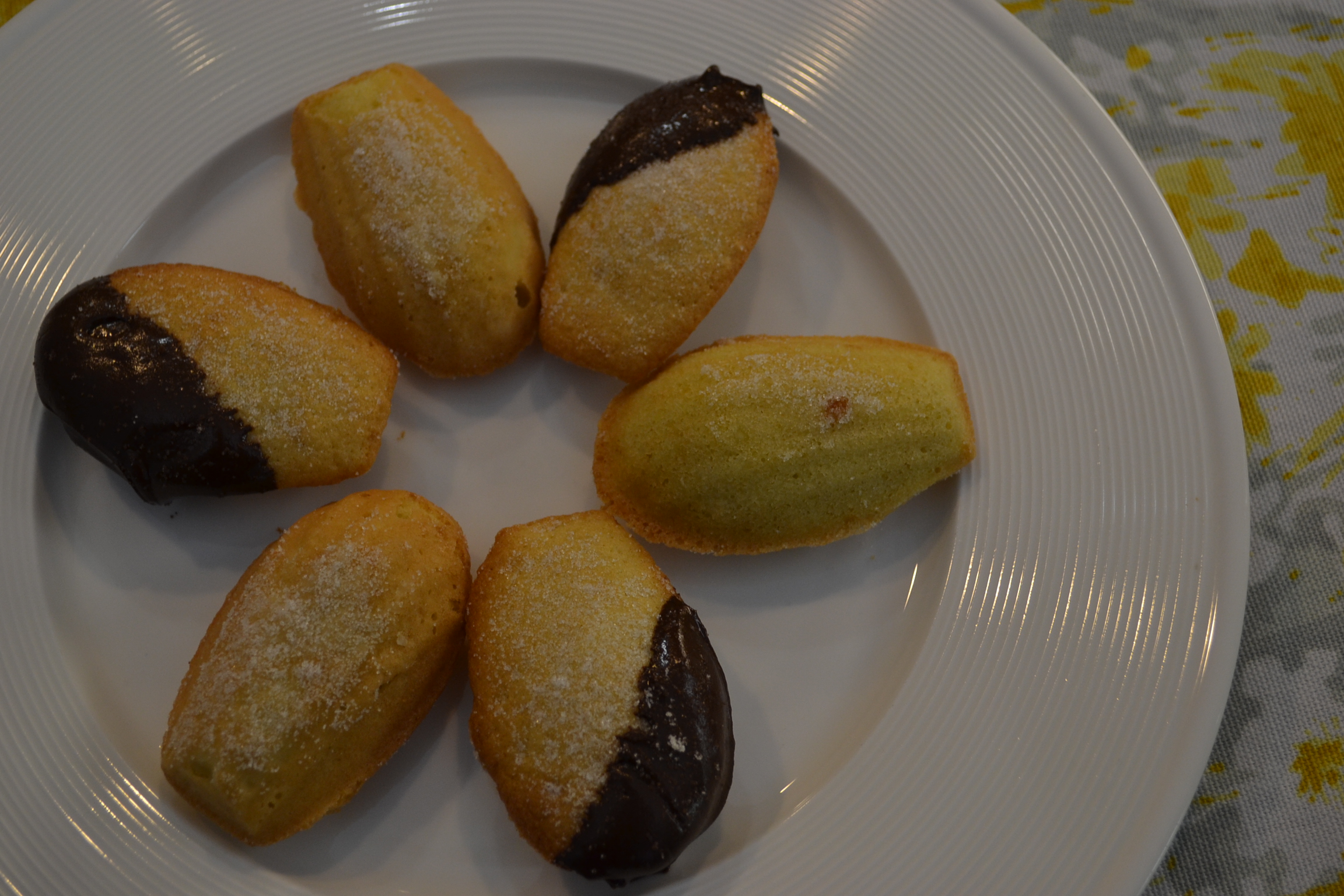 7. Optional: sprinkle sugar on the madeleines, melt the chocolate chips and dip the madeleines however you like.