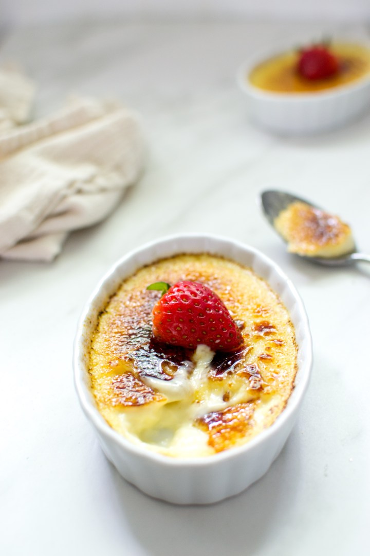For this recipe, I used 4 shallow ramekins that hold about 1/2 cup each (measured to the brim). You can use taller ramekins if you like, but just know that the bake time will likely be longer. Personally, I really like shallow ramekins so the ratio between the custard and the crunchy sugar topping is quite nice.
