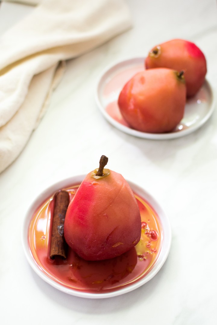 Have you ever had friends over for a dinner party and you’re left with all this wine? You could drink it yourself, but I personally think if it’s old wine, just cook with it! One of my favorite ways to use up old red wine is making poached pears. It looks so decadent and yet it’s so simple to make.