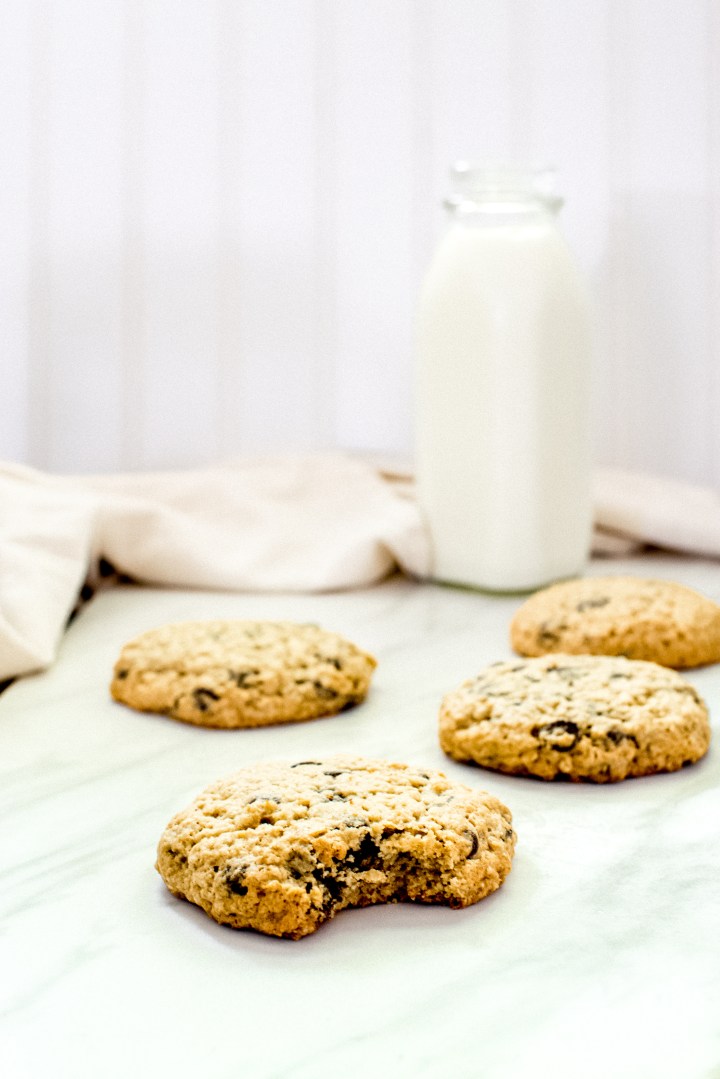 - Add oat mixture and the dry ingredients to the butter mixture and mix on low until well incorporated. Add chocolate chips and mix until just mixed. Divide dough into 8 large balls. Flatten gently on the cookie sheet.