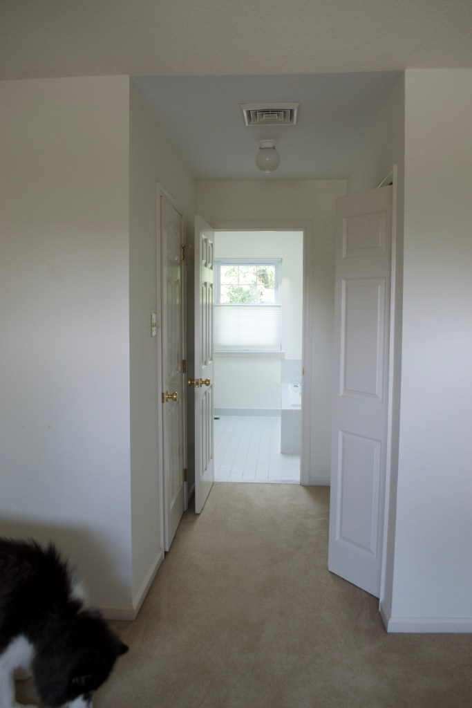 In our bedroom, when you turn the corner, it divides into three zones. On the left is the walk-in closet (which is now Ian’s closet). On the right is my closet. And straight ahead is the en suite bathroom. Since Ian’s closet and mine are in “separate zones”, I’ll put his closet transformation in a separate post (part 2).