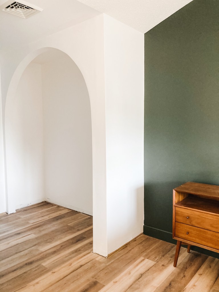 After attaching the arch, I hung drywall, mudded, painted, and I was left with a pretty looking arch! I installed our new baseboards and was ready for the closet to take shape. I ended up buying the Malm dresser from IKEA because I love the simplicity of it. I bought these 4 inch wooden furniture legs and attached 6 of them to the bottom. I had to create a little 2×4 base on the bottom of the dresser in order to attach the legs, though.