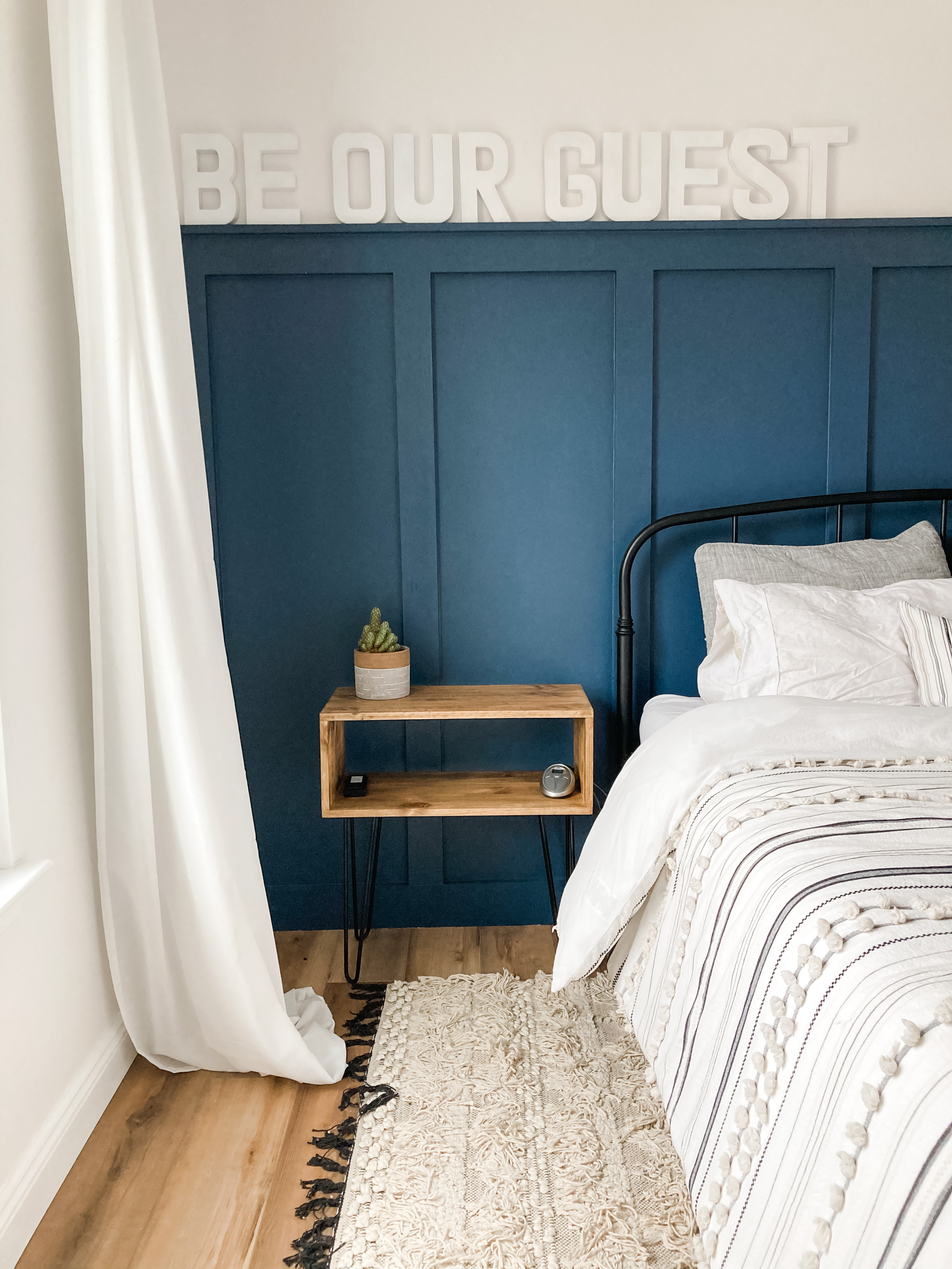 In early November of last year, I was on a mad dash to quickly finish up our guest room. My in-laws were visiting and I needed the guest room to be functional and comfortable for their stay. I had painted the entire room, swapped out the ceiling fan, added a board and batten accent wall, tore out the carpet and replaced it with new flooring, and spray painted the metal bed from a cream color to a matte black. I needed some nightstands to round out the space. I immediately thought about DIY some nightstands to save money.