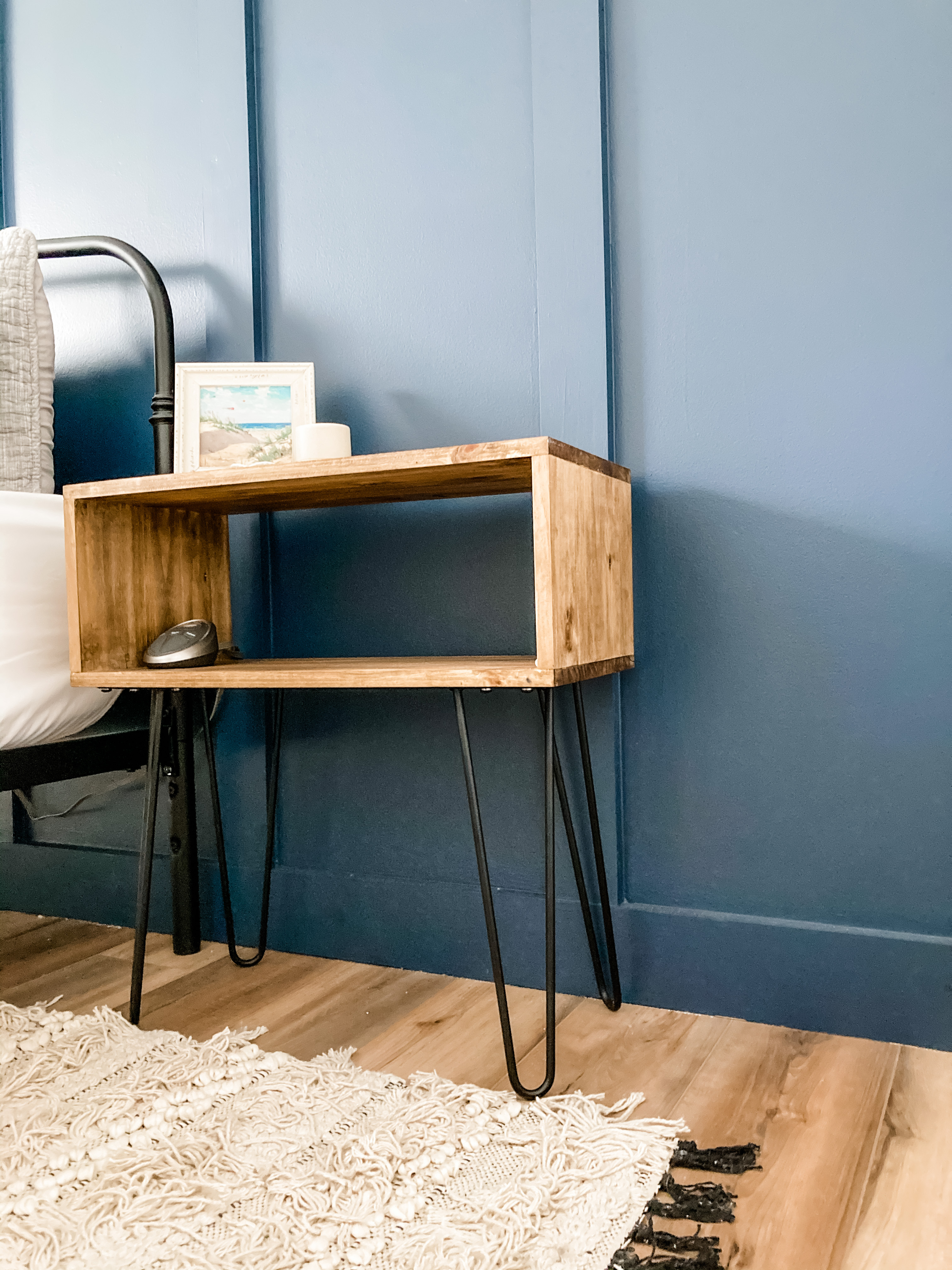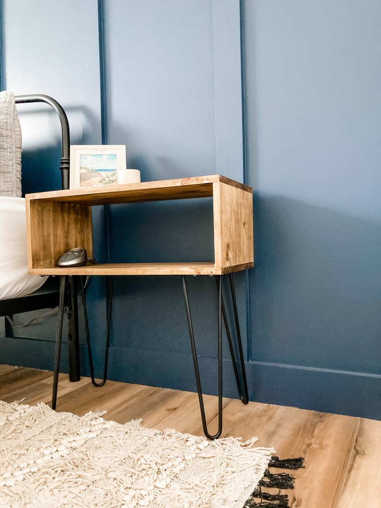 Good nightstands can cost quite a bit of money. I set out a goal to DIY a pair of nightstands that could match a variety of styles and stay under $100 (I ended up spending about $70 total). I decided to make a boxy nightstand and used hairpin legs to make this easy look professional. I bought my hairpin legs off Amazon and set off to the hardware store. I went to the lumber section and looked at my options. Since I was on a budget, I looked at edge-glued project panels. Project panels are pieces that are already cut to specific sizes, and typically are already sanded and ready for finishing. Edge-glued means that instead of one solid piece of wood, manufacturers often glue together smaller pieces to make a larger piece, hence making it more affordable than buying one large piece.