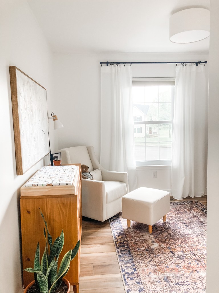 I decided to mix and match store-bought and DIY for this room. The major furniture in this room was store-bought, but I decided to DIY a few things in this room. Instead of getting a separate changing table, I opted to make a changing tray out of 1×3. I ordered the changing pad off of Etsy, since my dresser is a little bit on the slimmer side. So by DIY-ing the changing tray, I was able to really customize it to the exact size. Ian’s homework for the next month is figuring out a stain match so we can stain the changing tray to match the table exactly.