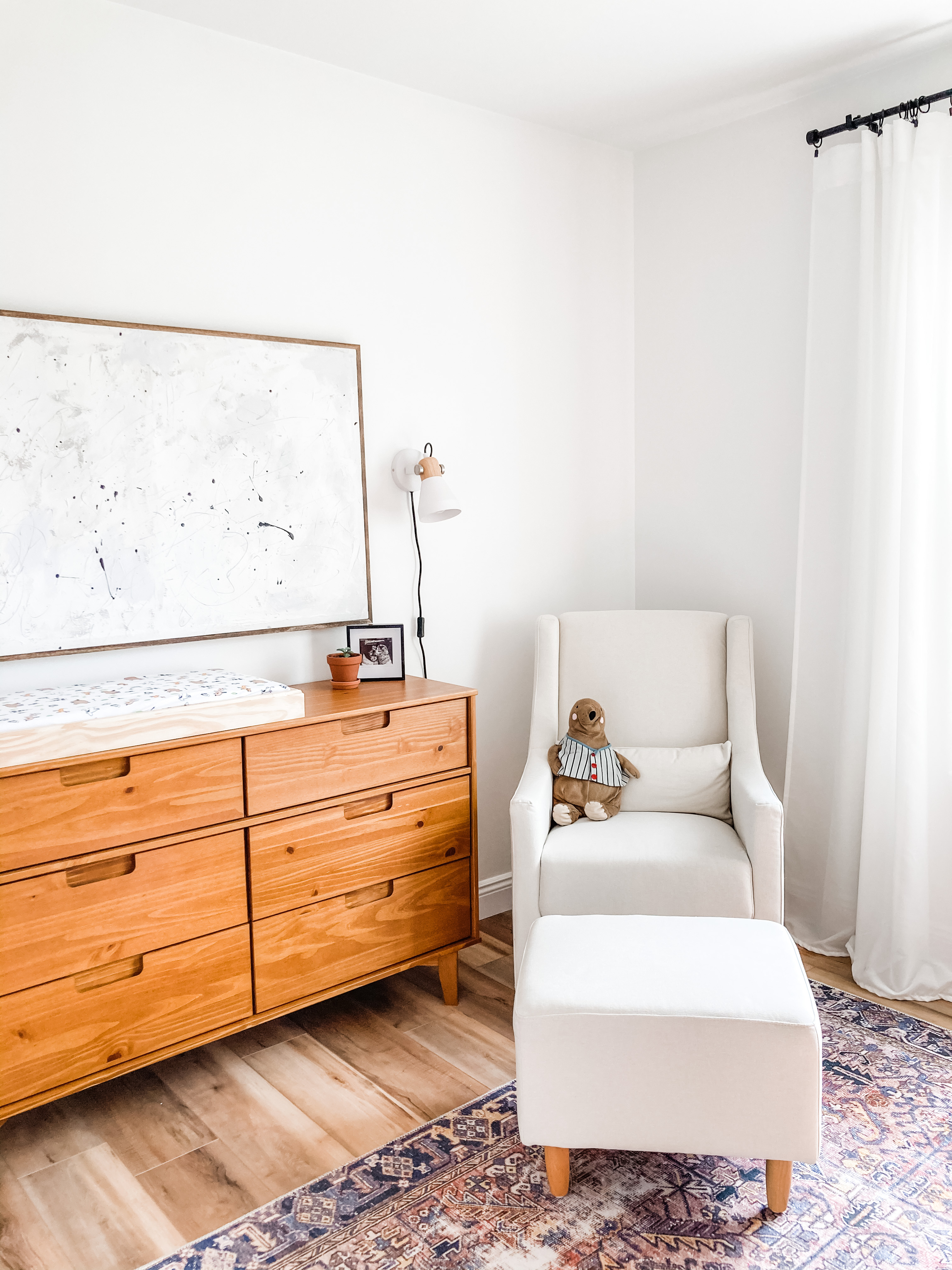 I decided to mix and match store-bought and DIY for this room. The major furniture in this room was store-bought, but I decided to DIY a few things in this room. Instead of getting a separate changing table, I opted to make a changing tray out of 1×3. I ordered the changing pad off of Etsy, since my dresser is a little bit on the slimmer side. So by DIY-ing the changing tray, I was able to really customize it to the exact size. Ian’s homework for the next month is figuring out a stain match so we can stain the changing tray to match the table exactly.